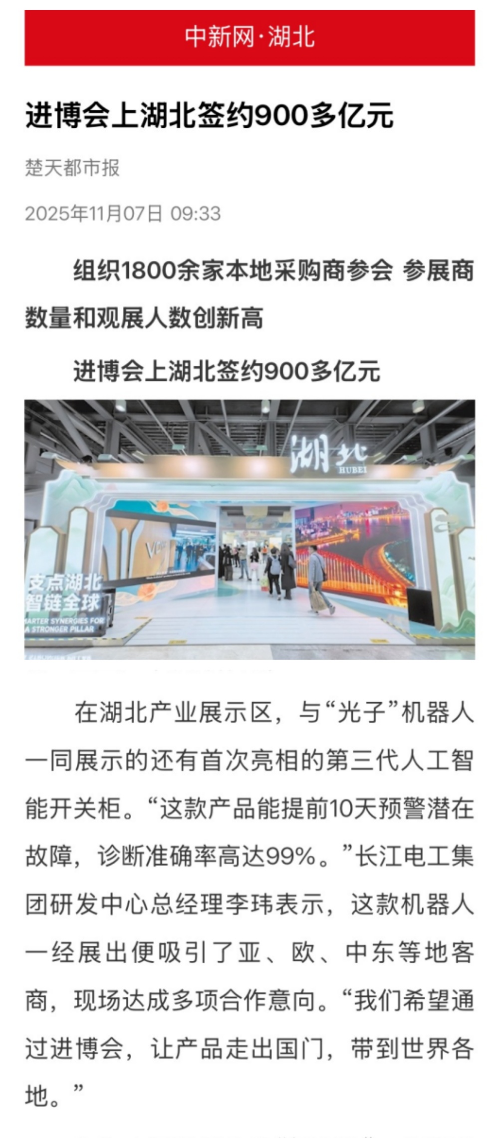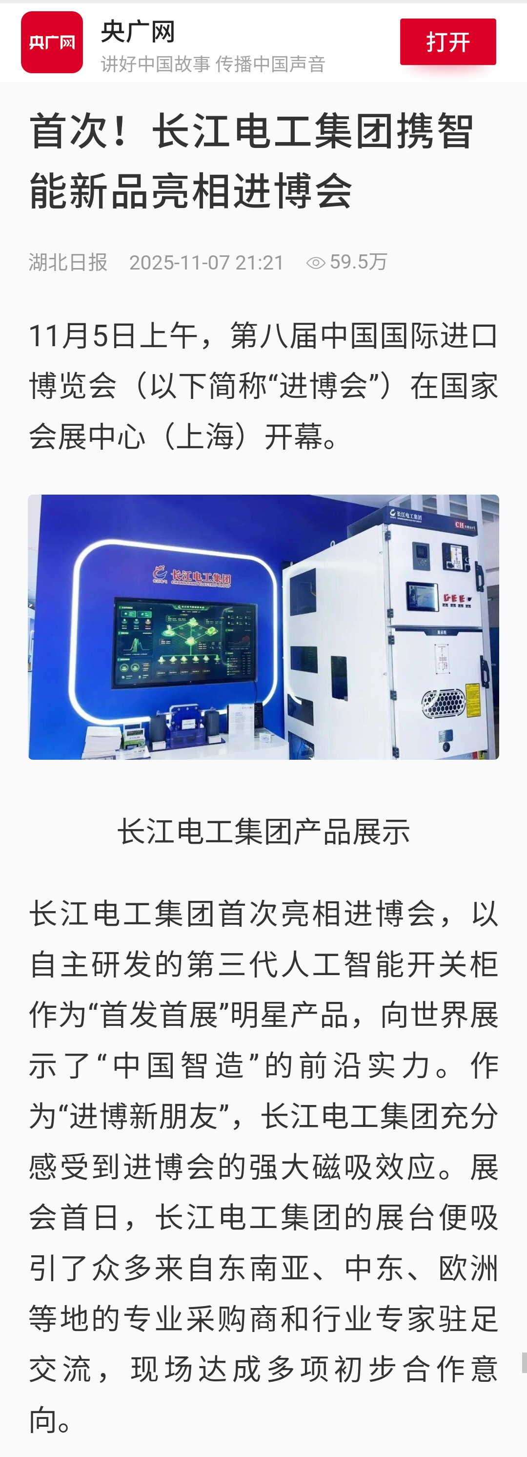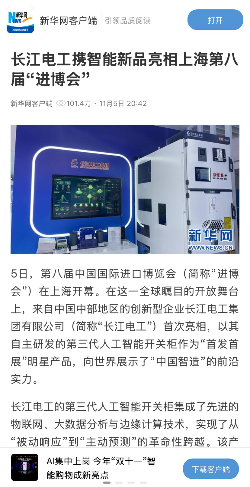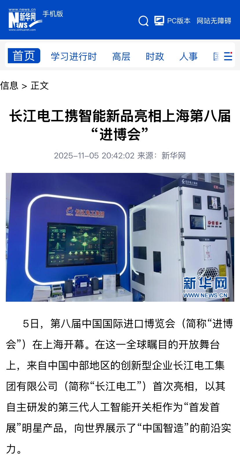 作為智能電網(wǎng)和新能源建設(shè)引領(lǐng)者,長江電工集團以“首發(fā)首展”的第三代人工智能開關(guān)柜為核心展品,攜多款自主研發(fā)成果首次亮相進博會,吸引包含中央廣播電視總臺新聞頻道、中央廣播電視總臺中文國際頻道、新華網(wǎng)、央廣網(wǎng)、中國新聞網(wǎng)、湖北日報、湖北電視臺等中央及省級媒體廣泛關(guān)注和聚焦報道。