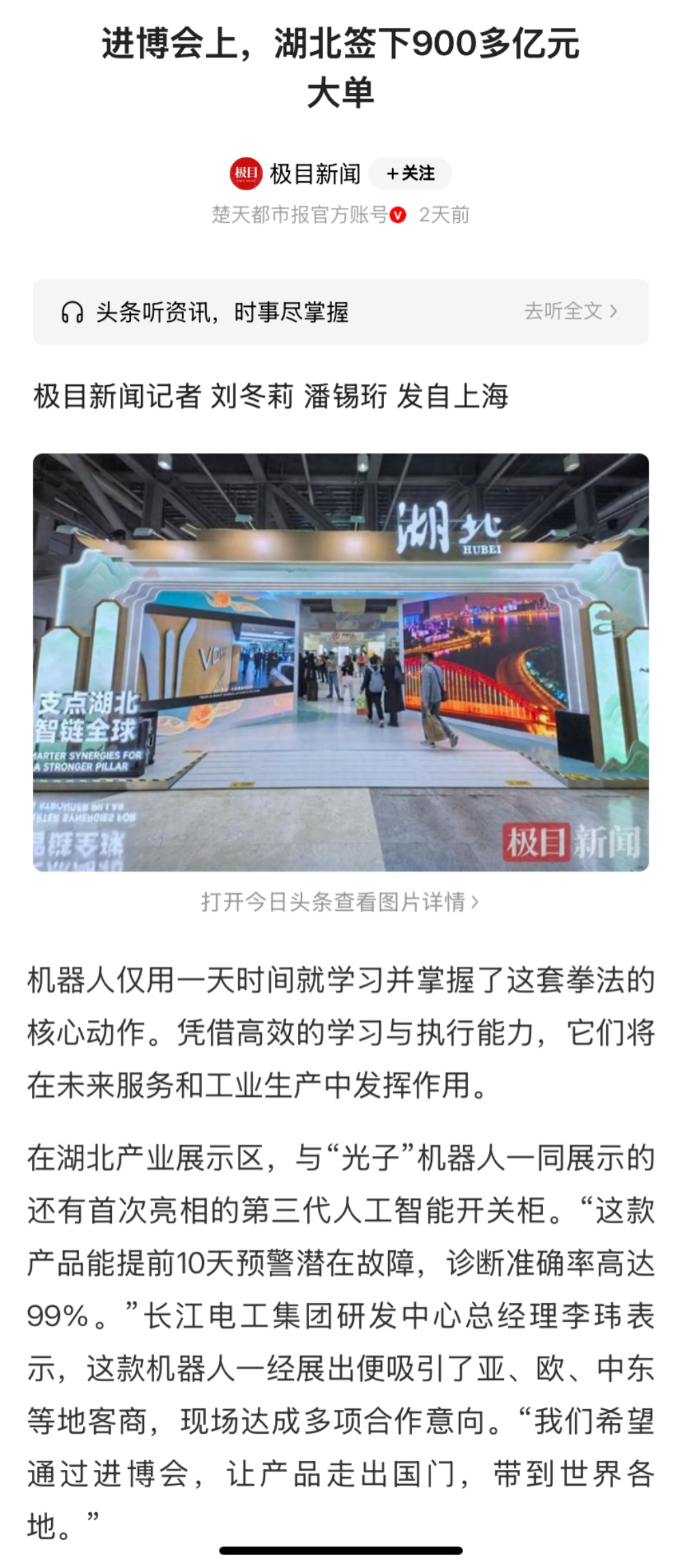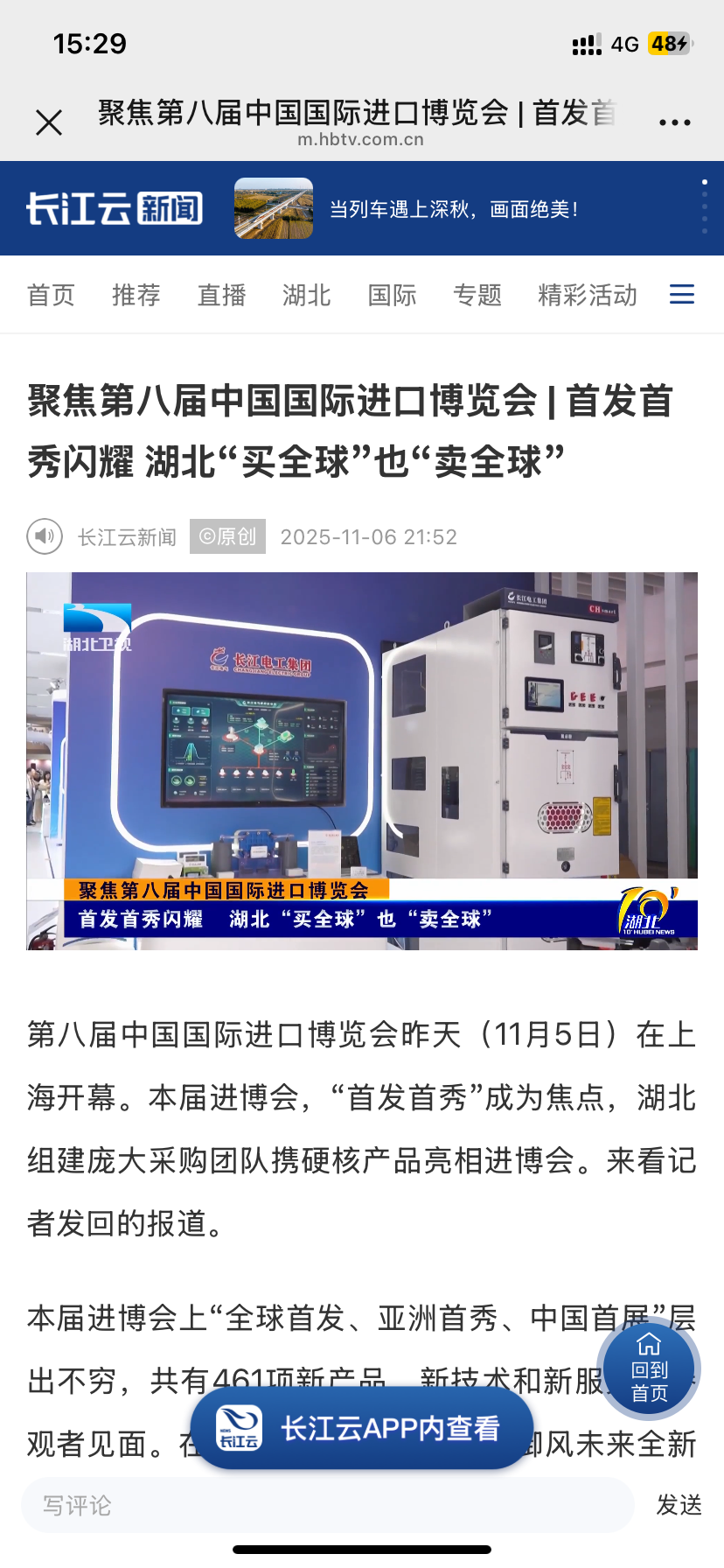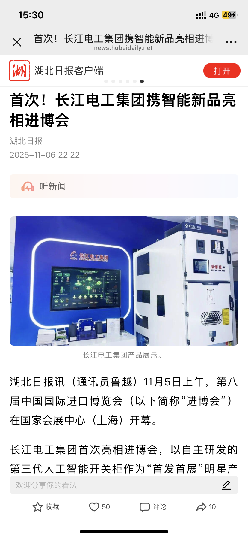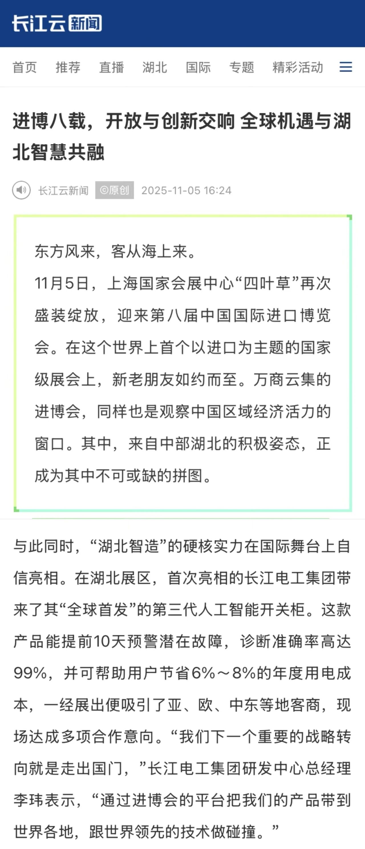 作為智能電網(wǎng)和新能源建設(shè)引領(lǐng)者,長江電工集團以“首發(fā)首展”的第三代人工智能開關(guān)柜為核心展品,攜多款自主研發(fā)成果首次亮相進博會,吸引包含中央廣播電視總臺新聞頻道、中央廣播電視總臺中文國際頻道、新華網(wǎng)、央廣網(wǎng)、中國新聞網(wǎng)、湖北日報、湖北電視臺等中央及省級媒體廣泛關(guān)注和聚焦報道。